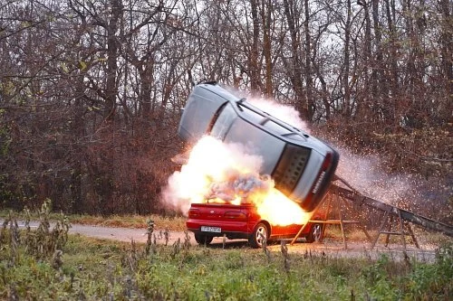 A Hungaroringre vezető szervízúton két autó ütközött, az egyik felrobbant, a másik hosszú repülés után ripityára tört. Ez a jelenet nem egy magyar filmben lesz: hanem egy kazah tévésorozat (001-es szállítmány) egyik epizódjában, noha a mutatvány kivitelezői mind magyarok voltak.